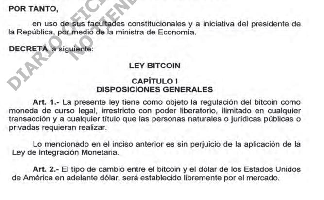 ⚠️⚠️Ley Bitcoin ya está publicada en Diario Oficial, entrará en vigencia el 7 de septiembre de 2021.