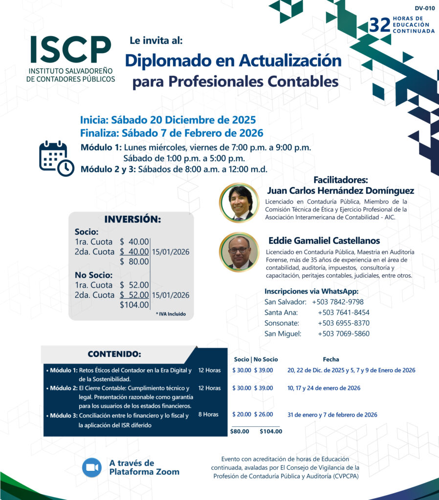 El Instituto Salvadoreño de Contadores Públicos (ISCP) invita al Diplomado en Actualización para Profesionales Contables, una formación acreditada de 32 horas que se desarrollará del 20 de diciembre de 2025 al 7 de febrero de 2026 a través de la plataforma Zoom. El diplomado está compuesto por tres módulos enfocados en ética profesional, cierre contable y conciliación fiscal-financiera, impartidos por expertos reconocidos en el área. Está dirigido a socios y no socios del ISCP, con inversión diferenciada e inscripción disponible vía WhatsApp en distintas regiones del país. Este evento cuenta con el aval del Consejo de Vigilancia de la Profesión de Contaduría Pública y Auditoría (CVPCPA), garantizando su validez como educación continuada.