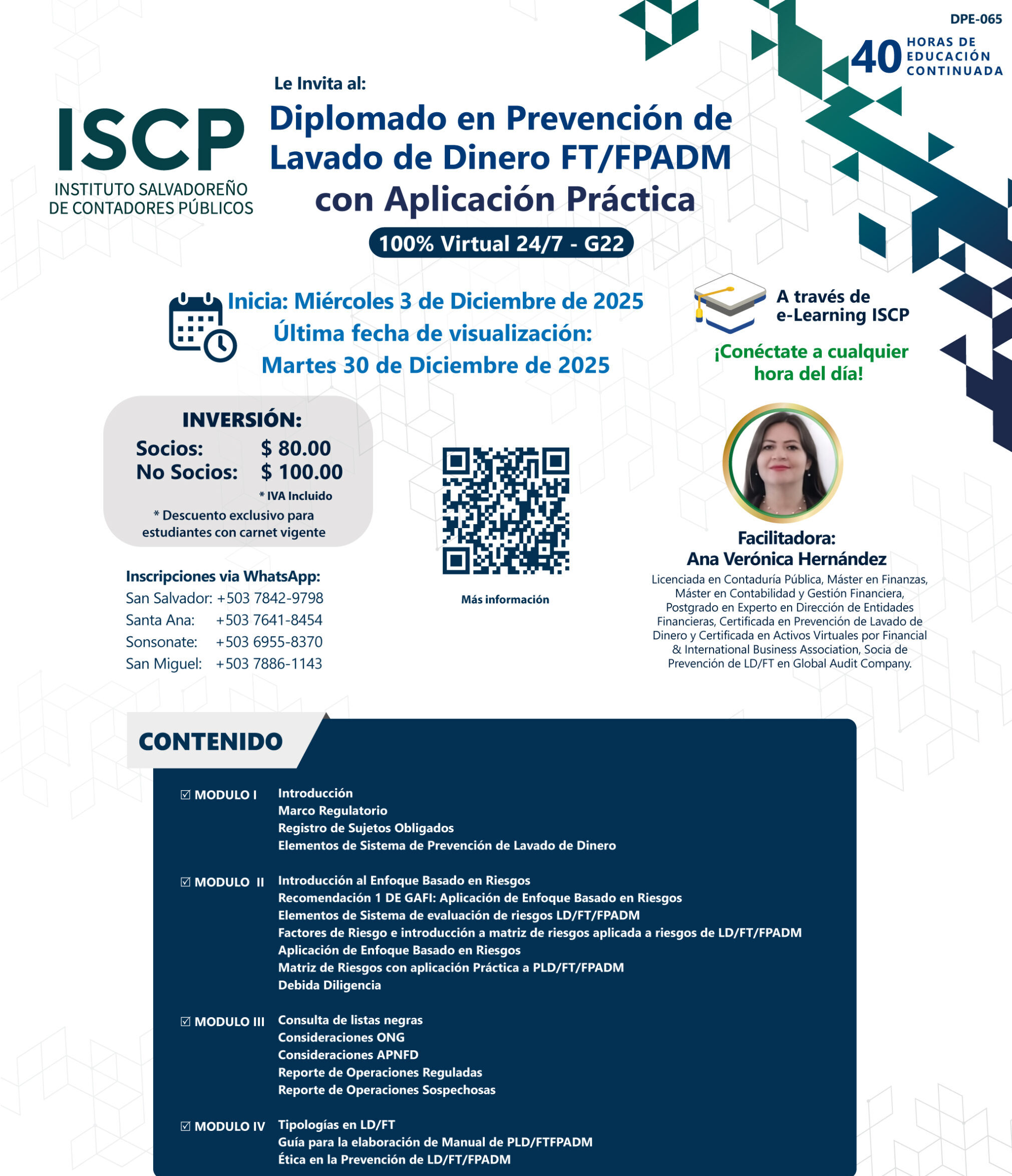 Le invitamos cordialmente a participara en nuestro Diplomado en Prevención de lavado de Dinero FT/FPADM con Aplicación Práctica organizado por el Instituto Salvadoreño de Contadores Públicos (ISCP). 🌟