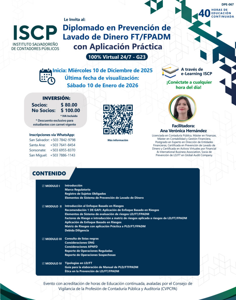 Le invitamos cordialmente a participara en nuestro Diplomado en Prevención de lavado de Dinero FT/FPADM con Aplicación Práctica organizado por el Instituto Salvadoreño de Contadores Públicos (ISCP). 🌟