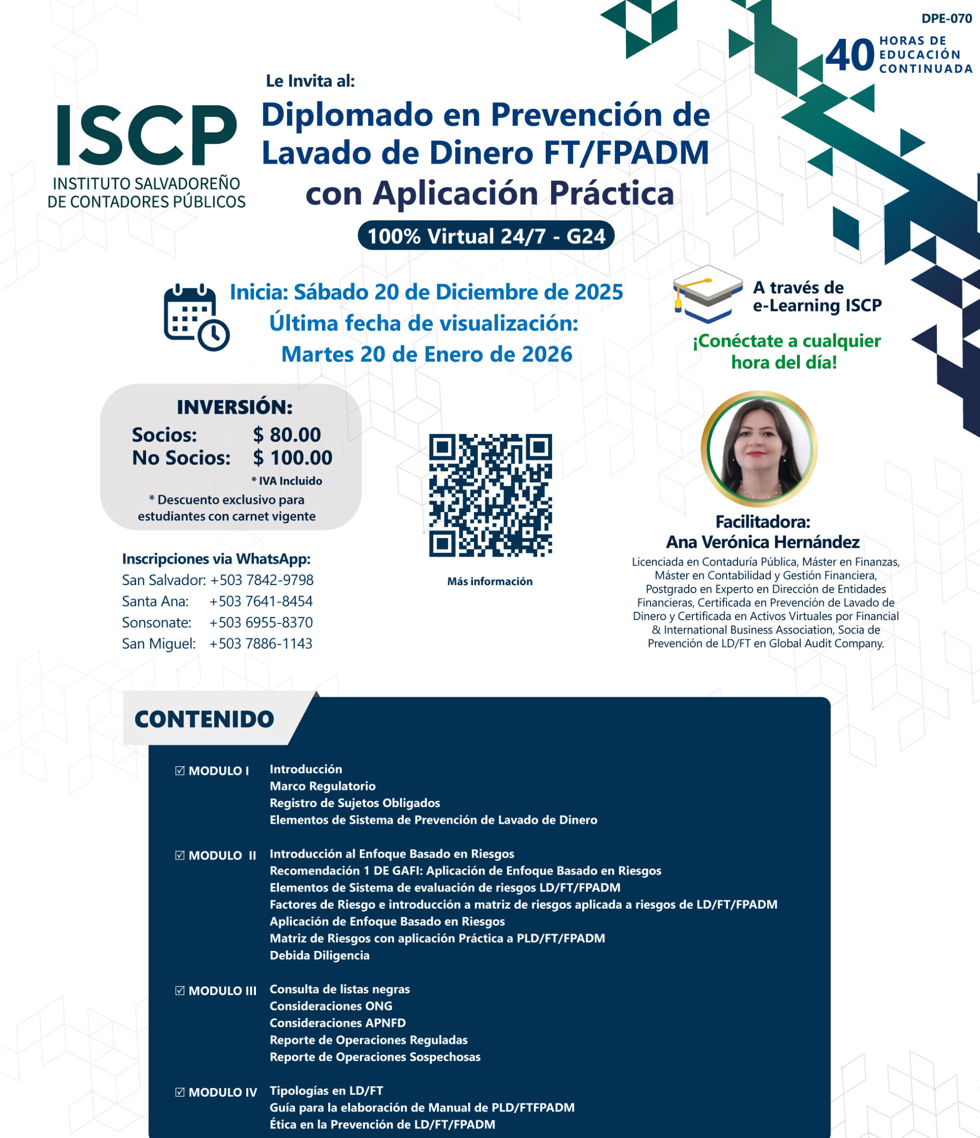 Le invitamos cordialmente a participara en nuestro Diplomado en Prevención de lavado de Dinero FT/FPADM con Aplicación Práctica organizado por el Instituto Salvadoreño de Contadores Públicos (ISCP). 🌟