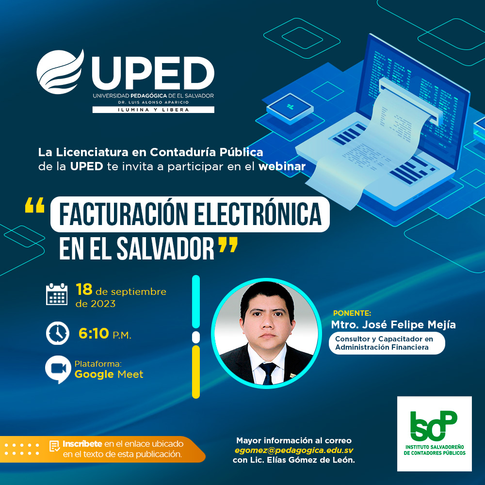 San Salvador, 18 de septiembre de 2023 - El Instituto Salvadoreño de Contadores Públicos (ISCP) reafirma su compromiso con la formación y el desarrollo profesional de los futuros contadores públicos participando en el Webinar sobre Facturación Electrónica, organizado por la Universidad Pedagógica de El Salvador. El evento se llevó a cabo el pasado lunes 18 de septiembre de 2023 y contó con la presencia del Licenciado José Felipe Mejía, miembro de la Junta Directiva del ISCP.